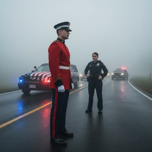 The convoy froze on a misty Virginia road, blue lights flashing through the fog. A young cop, hand on her holster, squared off against
