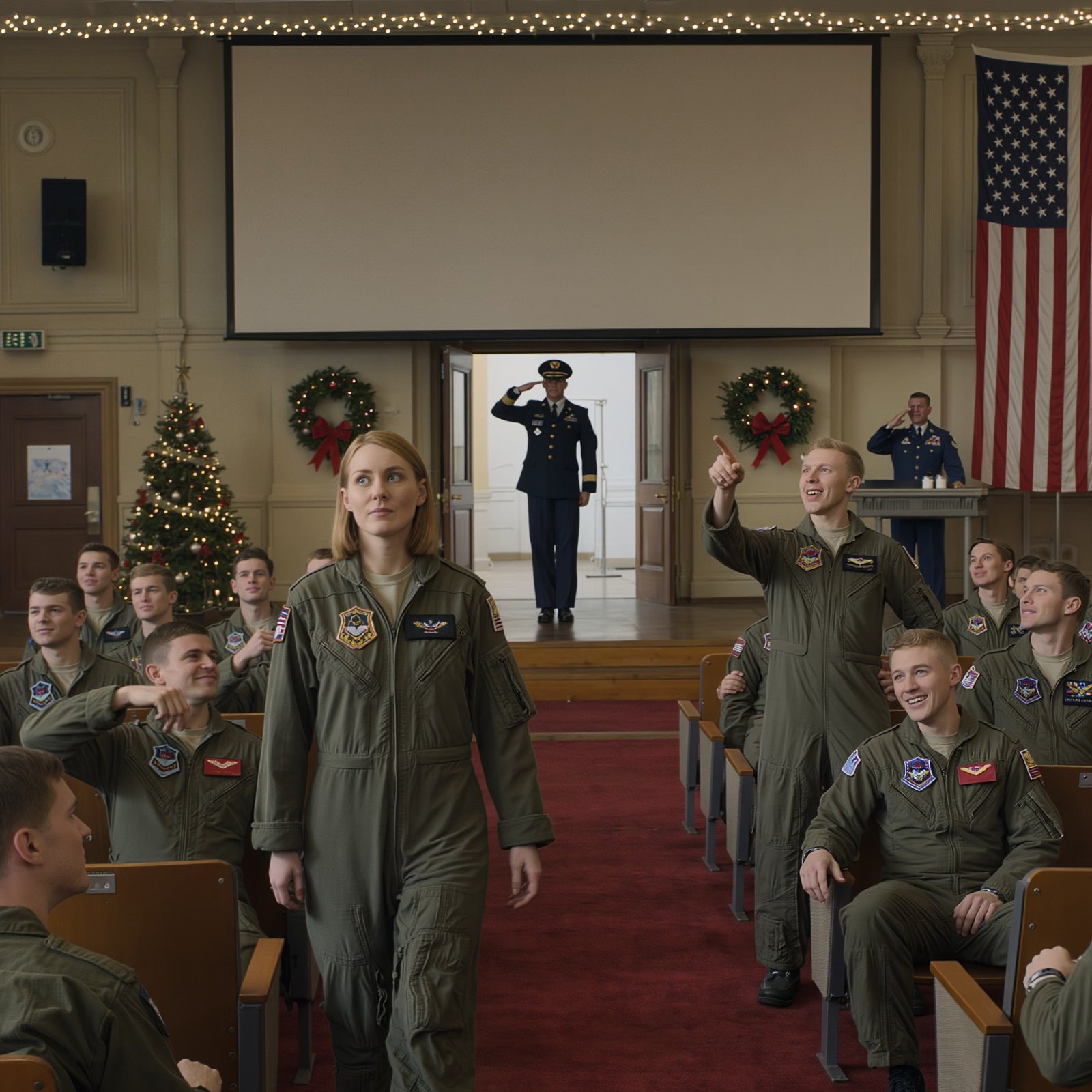 The laughter died instantly. The silence that followed was heavy, suffocating. The sound of a hundred bodies snapping to attention filled the air, the rustle of flight suits and the stomping of boots. Mark stiffened, his smirk vanishing, his eyes darting to the front.