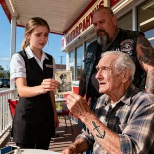 The biker scanned the room, his eyes landing on the corner booth. For a second, disbelief flickered across his face. Then he spoke — not loud, but firm enough to cut through the diner’s hum.