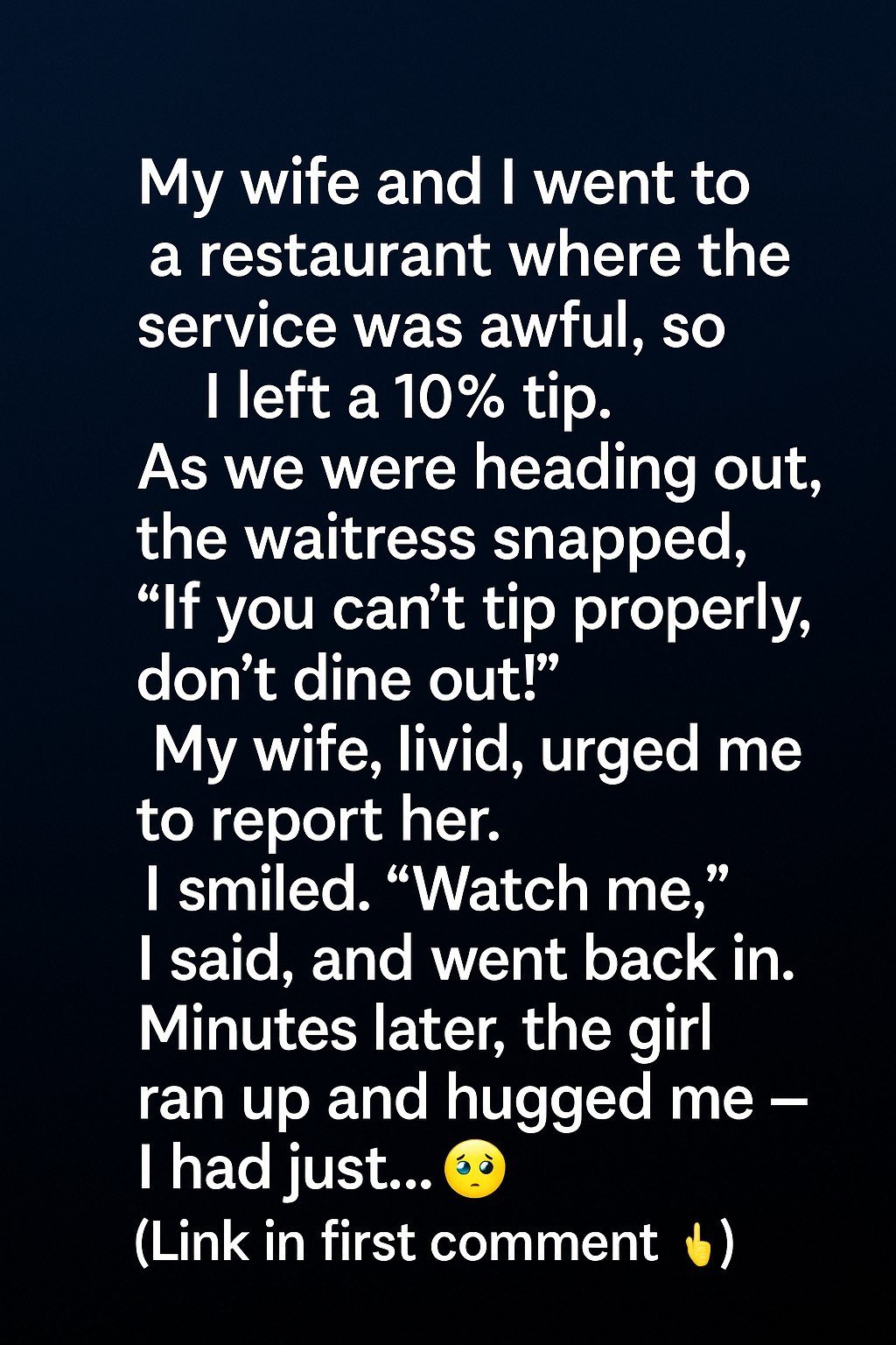 Her voice cut through the room just as we reached the door, sharp and trembling all at once. “If you can’t tip properly, don’t dine out.” My wife stiffened instantly, anger rising to her face, urging me to complain, to defend ourselves, to make it right. Yet beneath the harshness of the words, I heard something else—exhaustion stretched thin, frustration fraying at the seams. I asked my wife to trust me and turned back, not with indignation, but with curiosity and concern guiding my steps.