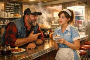 A long-haul trucker pulled into a crowded highway diner after miles on the road. He leaned over the counter and confidently spoke to the brand-new waitress.