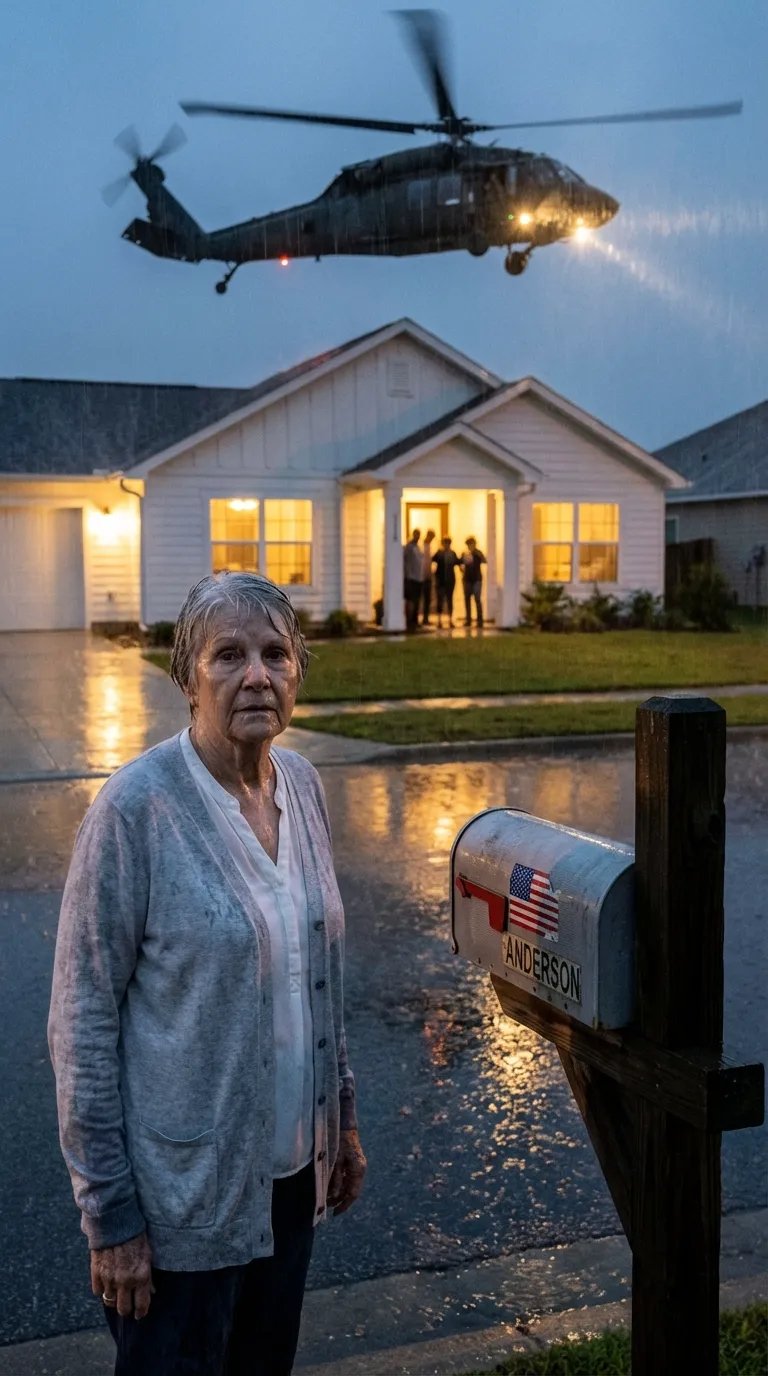 Minutes later the sound of rotor blades tore through the quiet street; a black helicopter dropped out of the gray sky and landed in the empty lot across from Holly’s perfect fountain, whipping rain and dust around like a storm sent just for us.