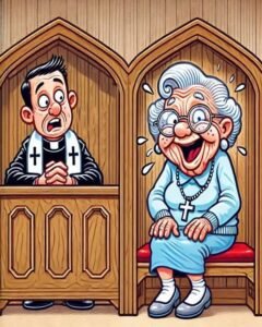The priest, gripping the edge of the booth, asks cautiously, “Did something… inappropriate happen?” Ethel cackles. “Oh yes, Father. Very inappropriate.” When asked when she last confessed, she thinks, “Probably… 1956?” The priest exhales. “Well, you’re overdue.” “Nope,” she says cheerfully. “I just wanted someone to brag to.”