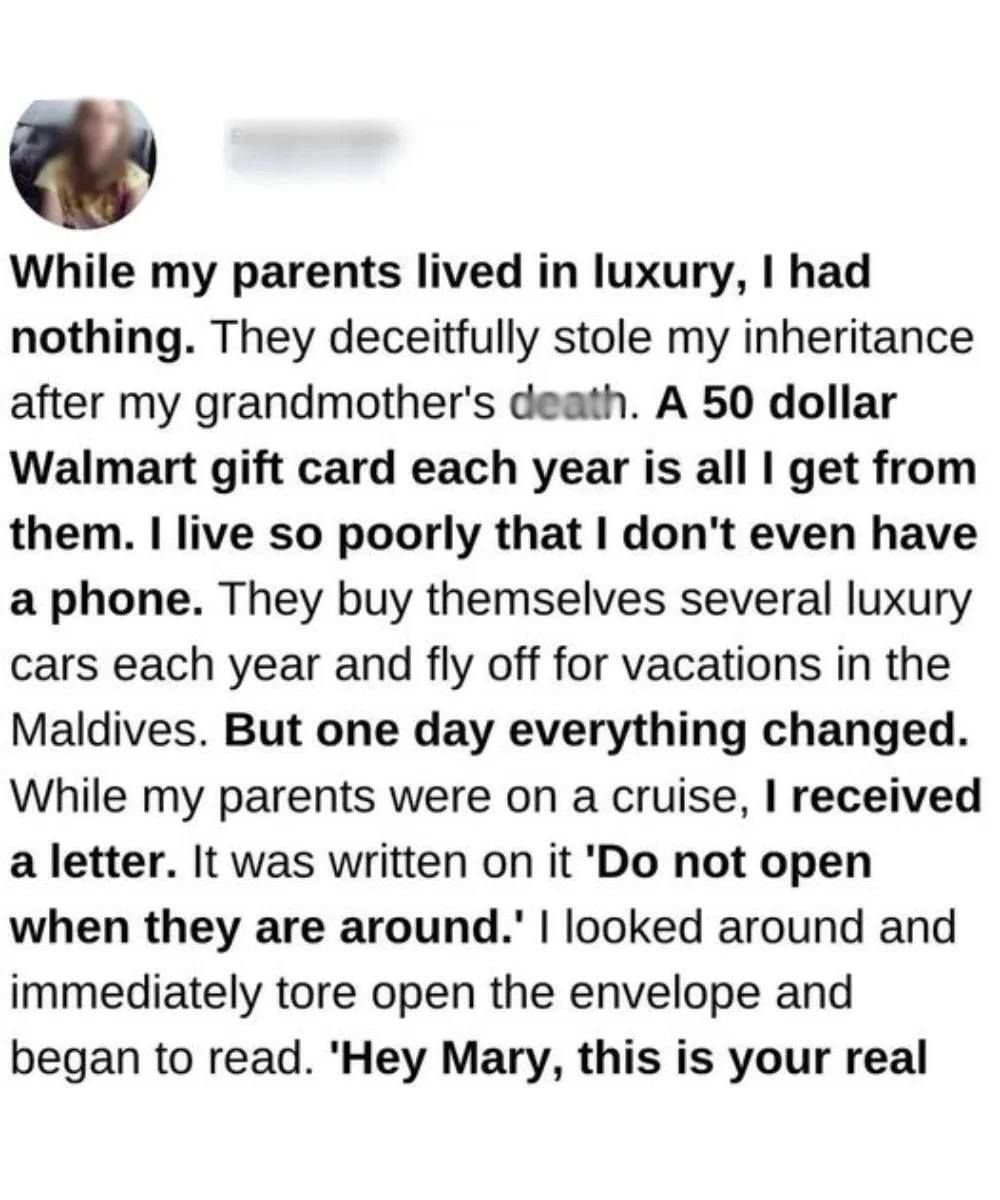 Then, during one of their long trips away, a letter arrived. The envelope carried a simple instruction: do not open it while they were present. I was alone, so I opened it immediately.