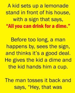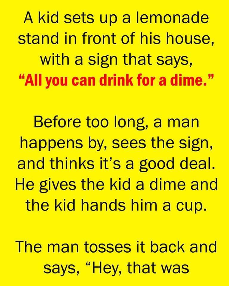 “Yes, it is,” the youngster said calmly as he reached for a cup. “But a little lemonade can fix it.”