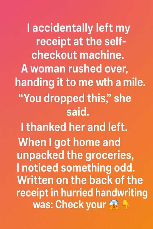 I started my shopping excursion the same way I always do, which is a habit I’ve gotten better at over the years. I grabbed a cart, walked down the aisles, checked off my list, and then went to the self-checkout, which is what I always did when I was in a hurry. I was ready to go when a woman ran after me. I had my luggage packed and my receipt printed. She gave me the piece of paper that I had forgotten.