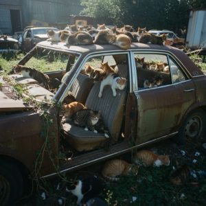 The old car was filled again. It was lively and had a lot of cats in it. They were everywhere. There are at least 30 of them. There was a calico cat on the roof, like a queen in the sun. From the dashboard, a sleek black cat calmly looked at us. The kittens rolled around on the back seat, and their small heads popped up behind the glass. Some people sat on the trunk, the hood, and even the bushes around us. Their gaze were a mix of skepticism and quiet confidence as they watched us.