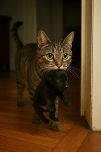 There she was, our nice, calm cat, slowly pacing across the floor with a tiny puppy in her teeth that was hardly breathing. Not in a terrible way. Not in a fun way. But like a mother tenderly moving her infant.