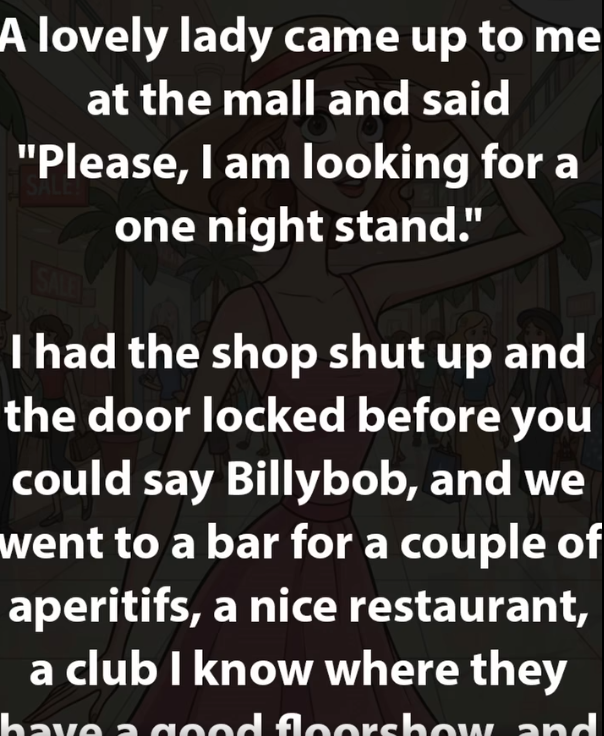 A gorgeous woman walked right up to me, her eyes shining and her stride full of confidence. “Please,” she continued, staring me in the eye, “I’m looking for a one-night stand.”