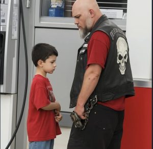 While I was filling up my car at a Shell station, a kid in pajamas and no shoes ran across the parking lot. There were military symbols and skulls on my leather vest.
