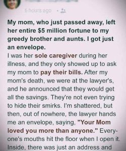 My family whispered about their new money, and the room was full with excitement. When the lawyer gave me the envelope, they scarcely looked at me.